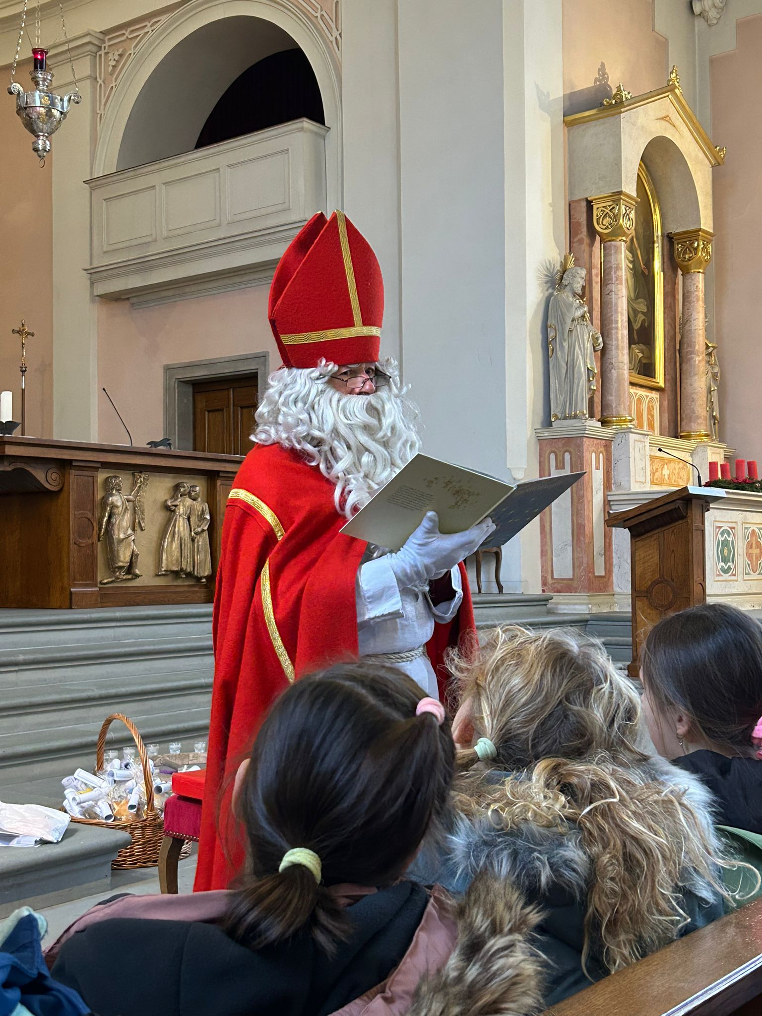 Sie staunten nicht schlecht, als plötzlich der Samichlaus in der Kirche auftauchte. Er freute sich über die vielen verschiedenen Weihnachtswünsche am Baum und erzählte ihnen passend dazu die wundervolle Geschichte vom Sternenbaum. Die angehenden Kommunions-Kids hörten dem Samichlaus gebannt zu. Zum Abschluss schenkte er ihnen einen grossen feinen Mailänderlistern und wünschte allen von Herzen frohe Adventstage und ein schönes Weihnachtsfest.