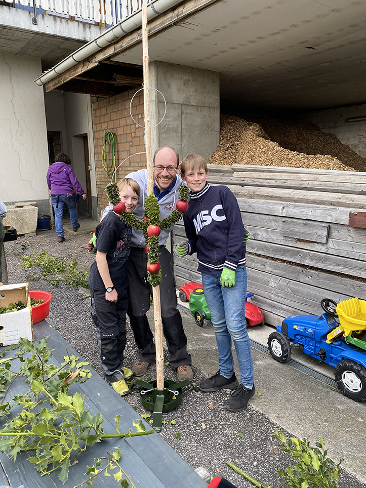 Dieses Jahr war es endlich so weit: Am Mittwoch vor dem Palmsonntag durfte der Pfarreirat zu einem kreativen Nachmittag auf den Hof von Ruth und Martin Burkart einladen. Im Vorfeld waren Ernst Fankhauser, Sepp Galliker und Hanspeter Roth unterwegs um das benötigte Material zusammenzustellen. Der Nachmittag war ein voller Erfolg, 30 Personen haben fleissig an neun unterschiedlich grossen Palmen gearbeitet. Sepp und Anita Huber standen allen mit Rat und Tat zur Seite. Die Motivation war enorm: während die einen wacker Stechpalmenblätter abschnitten, bereiteten die anderen die Stangen vor. Das Blättli Aufstecken wurde dann zur Geduldsprobe: ‚Längets scho, chammer de Öpfu scho drah tue?’ - ‚Nei, nei… muesch scho nochli’ war öfters zu hören. Die wohlverdiente Zobigpause mit feinen Kuchen fiel kurz aus. Nur eine dringend benötigte Stärkung, dann gingen alle zurück zu ihrem Werk. Gegen Abend waren alle Palmen fertig, wieder packten alle mit an und so war ruckzuck aufgeräumt. Müde aber glücklich zogen alle mit ihren Palmen von Dannen.