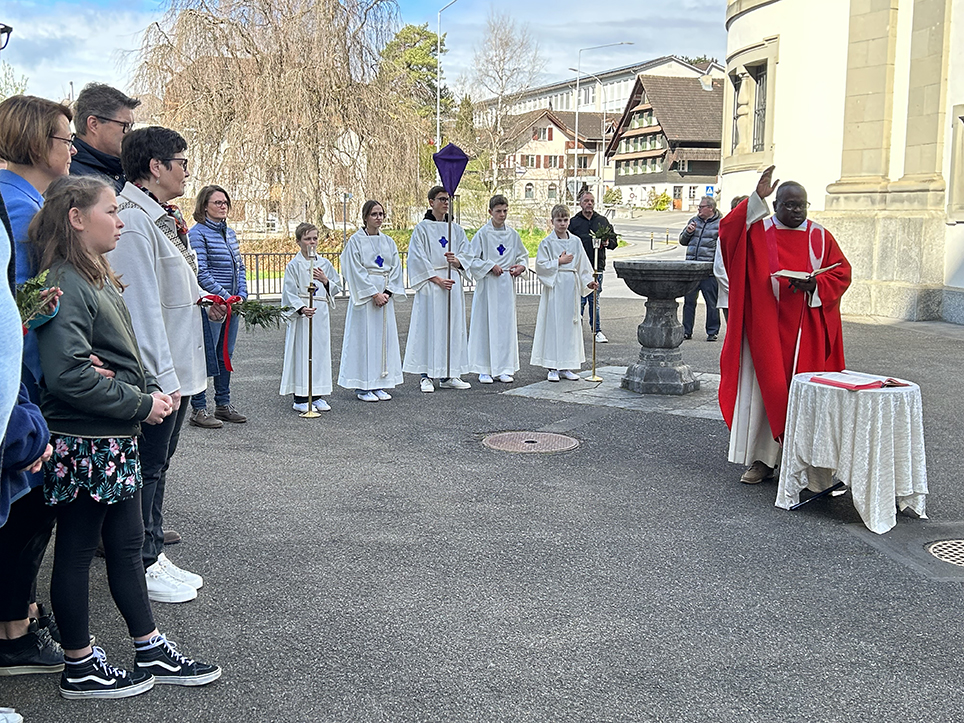 Entstanden sind, unter fachkundiger Anleitung von Lisbeth Aregger und Priska Jung, wunderschöne Palmkränzli, die die Kirche an Palmsonntag zierten. Auch am Mittwoch und am Dienstag waren die 3./4. Klässler mit ihrer Aushilfslehrerin Aline Erni im Wald unterwegs und stellten Palmsträusschen her. Diese erfreuten die Bewohner der Dösselen und die Kirchgänger an Palmsonntag, fleissig wurden sie gekauft und so die alte Tradition mit nach Hause genommen. Der Start der Karwoche wurde in der schön geschmückten Kirche feierlich eröffnet. Priester Poycarp segnete die Palmsträusschen und -kränzli zu Beginn der Feier. Sie war geprägt von der Passionsgeschichte, die jedes Jahr die Zeit der Karwoche prägen.