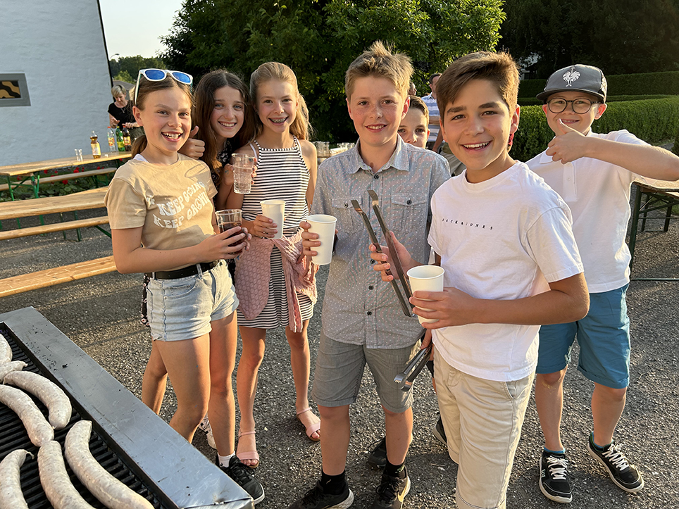 Anschliessend ging es im Pfarrgarten rund. Nino und Aaron haben für alle die feinen Würste grilliert und bei gemütlichen Gesprächen wurden sie gegessen. Nochmals zusammengesessen, miteinander gespielt und gelacht und so gingen alle zufrieden nach Hause.