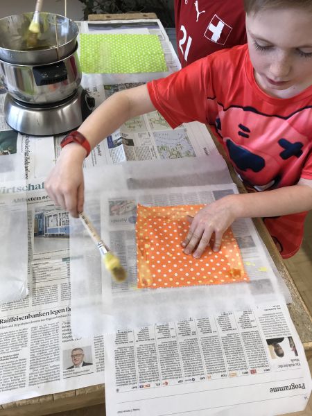 Die Begeisterung war gross, als erklärt wurde, dass in der nächsten Reli-Stunde Bienenwachstücher gemacht werden, welche wir zu Gunsten des Fastenopfers verkaufen. Voller Tatendrang und Freude wurde dann in der nächsten Stunde gepinselt, gebügelt und gemalt. Dank der vielen Bestellungen konnten wir den Reinerlös von Fr. 560.– an das Fastenopfer-Projekt überweisen.