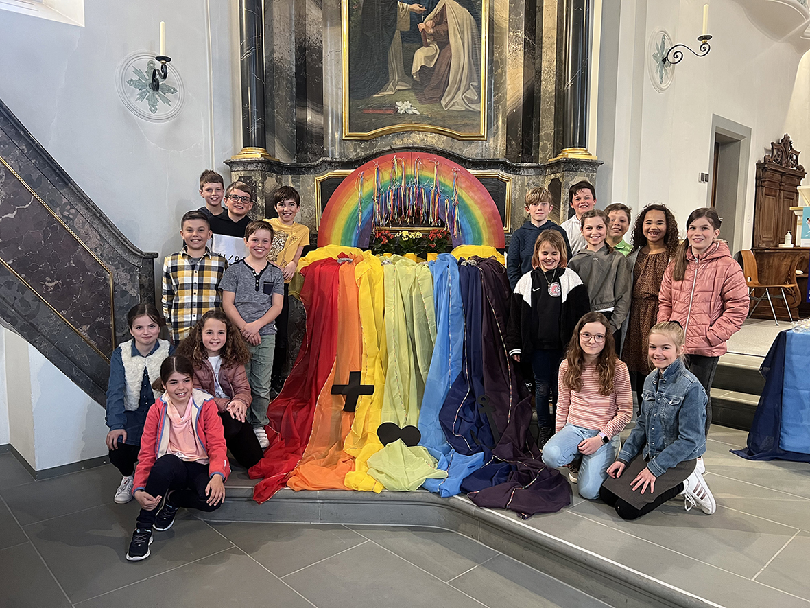 Am Samstag, 12. März 2022 gingen die Mädchen und Buben der 4. Klasse auf den Versöhnungsweg. Der Versöhnungsweg stand unter dem Thema: Versöhnung unter dem Regenbogen. Bei jedem der fünf Posten, haben die Schüler sich mit einem Thema in ihrem Leben auseinandergesetzt. Mit Bildern und Impulsfragen konnten die Schülerinnen und Schüler gemeinsam mit ihrer Vertrauensperson über das eigene Leben ins Gespräch kommen. So wurden die eigenen Stärken und Schwächen und die Möglichkeiten zur Veränderung und zum Neuanfang entdeckt.
